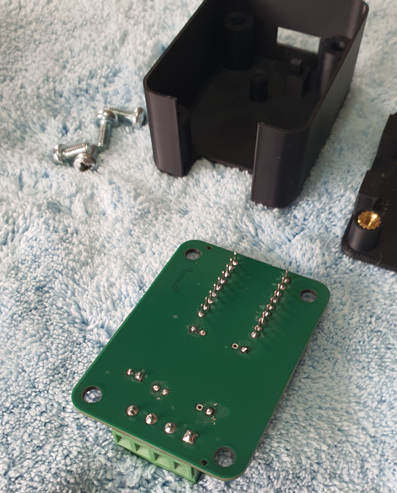 - Turn the PCB upside down again and place it inside the cover as it was before. Make sure the screw terminals are at the end that has a large opening.