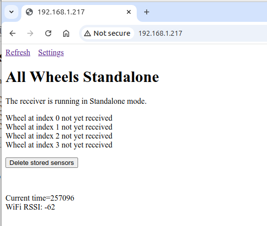 The messages about the 4 wheels will be different dependng upon how you have configured it. Here, the receiver is configured as a standalone waiting for BLE messages for all four wheels (the default configuration). The friendly name was set to “All Wheels”. The page will automatically refresh every 30 seconds.